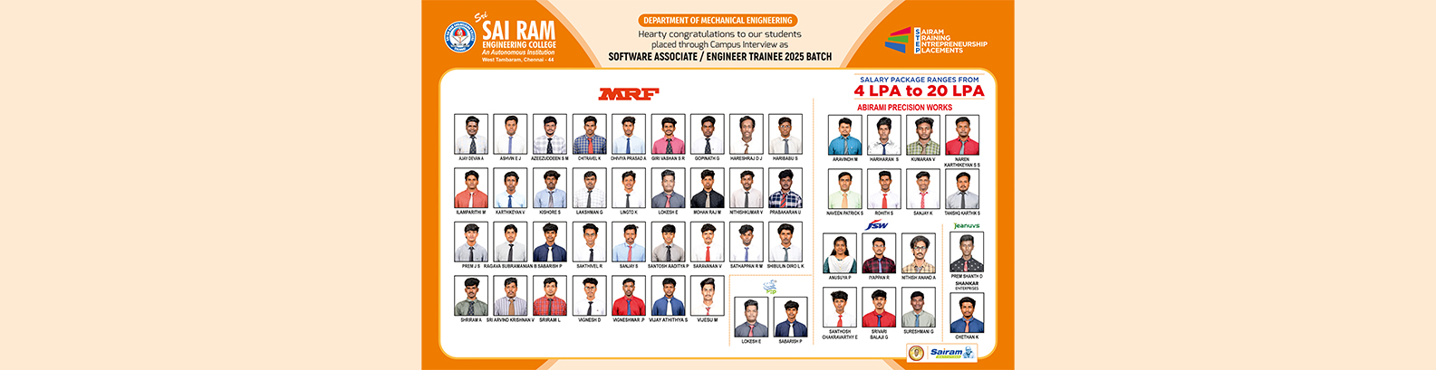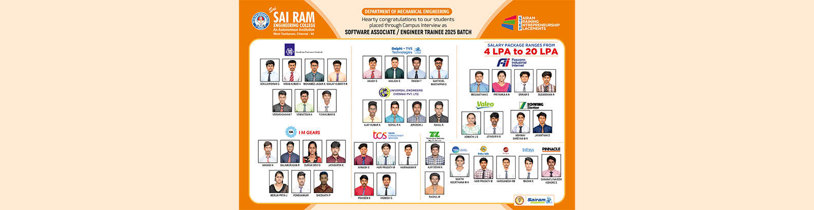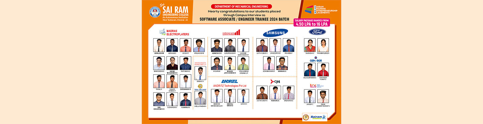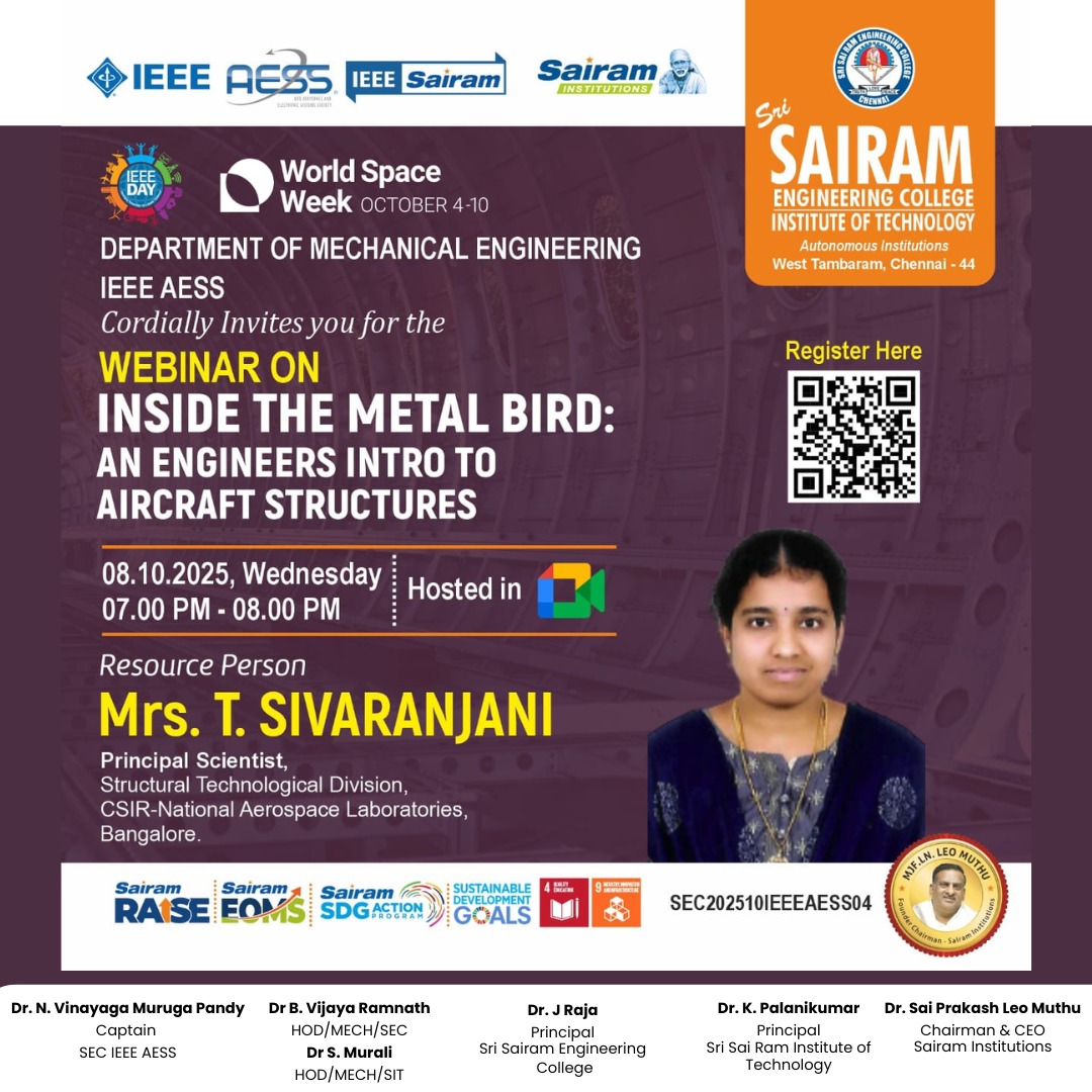 The Department of Mechanical Engineering at Sri Sai Ram Engineering College, established in 1995, has steadily advanced into a dynamic center for technical education. Accredited by the National Board of Accreditation, the Department is supported by a cadre of highly qualified, experienced faculty and dedicated support staff. This department serves over 350 students and consistently achieves exceptional academic outcomes, including distinctions and university ranks (even gold medals), particularly in the Anna University examinations. A robust placement record further underscores its success in preparing students for professional life.