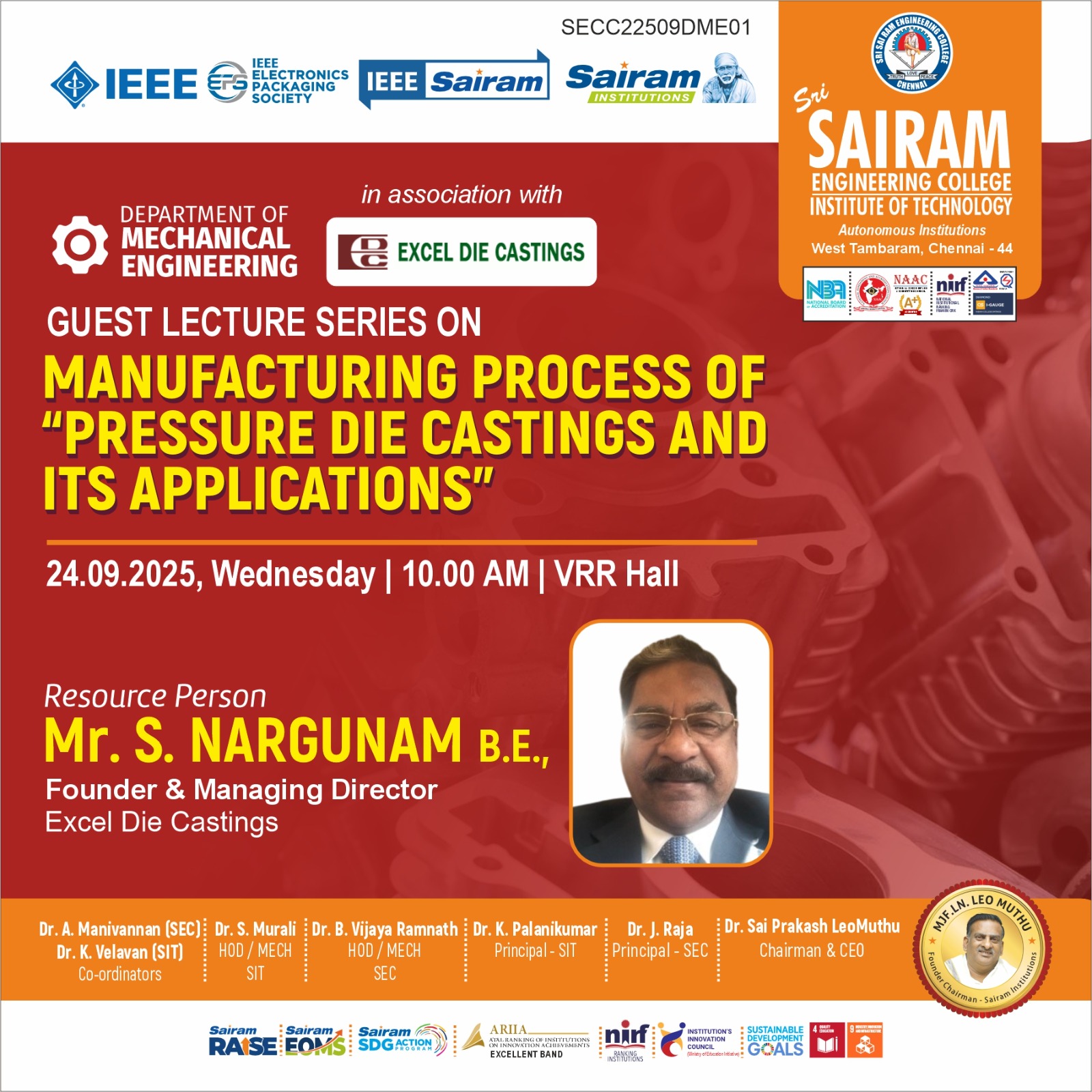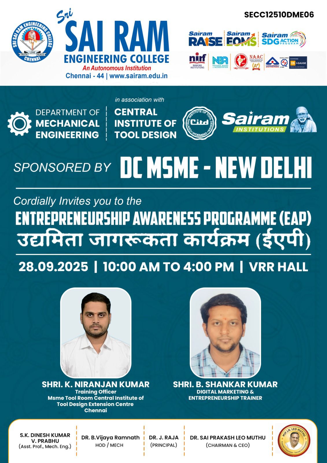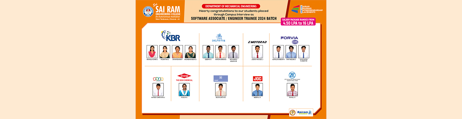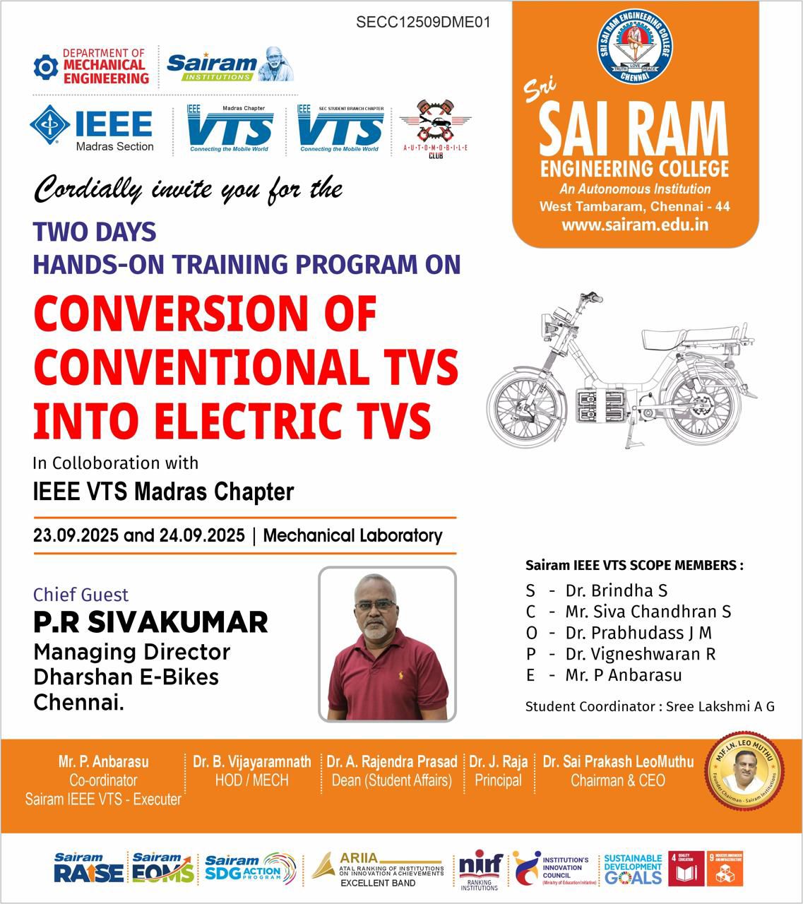 The Department of Mechanical Engineering at Sri Sai Ram Engineering College, established in 1995, has steadily advanced into a dynamic center for technical education. Accredited by the National Board of Accreditation, the Department is supported by a cadre of highly qualified, experienced faculty and dedicated support staff. This department serves over 350 students and consistently achieves exceptional academic outcomes, including distinctions and university ranks (even gold medals), particularly in the Anna University examinations. A robust placement record further underscores its success in preparing students for professional life.