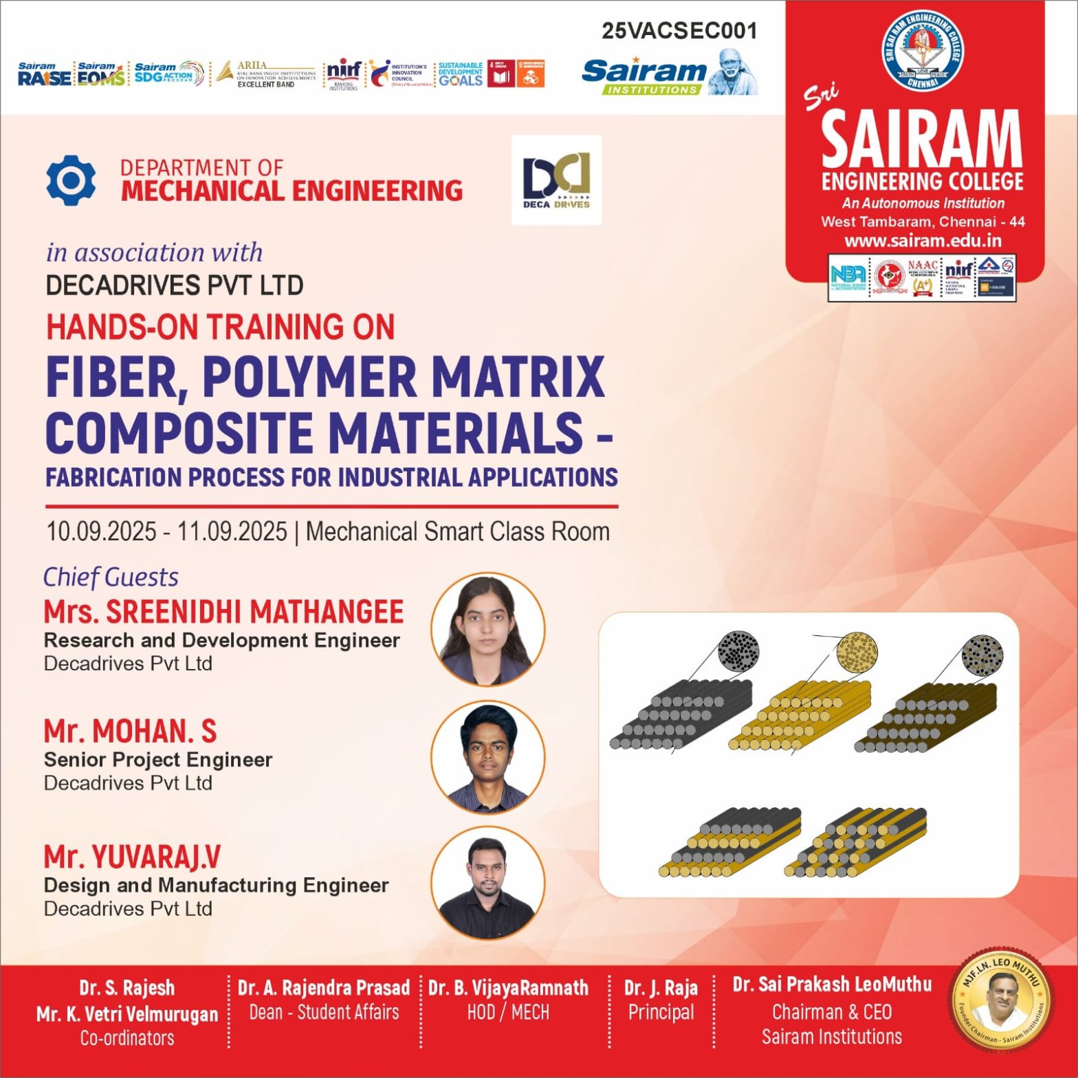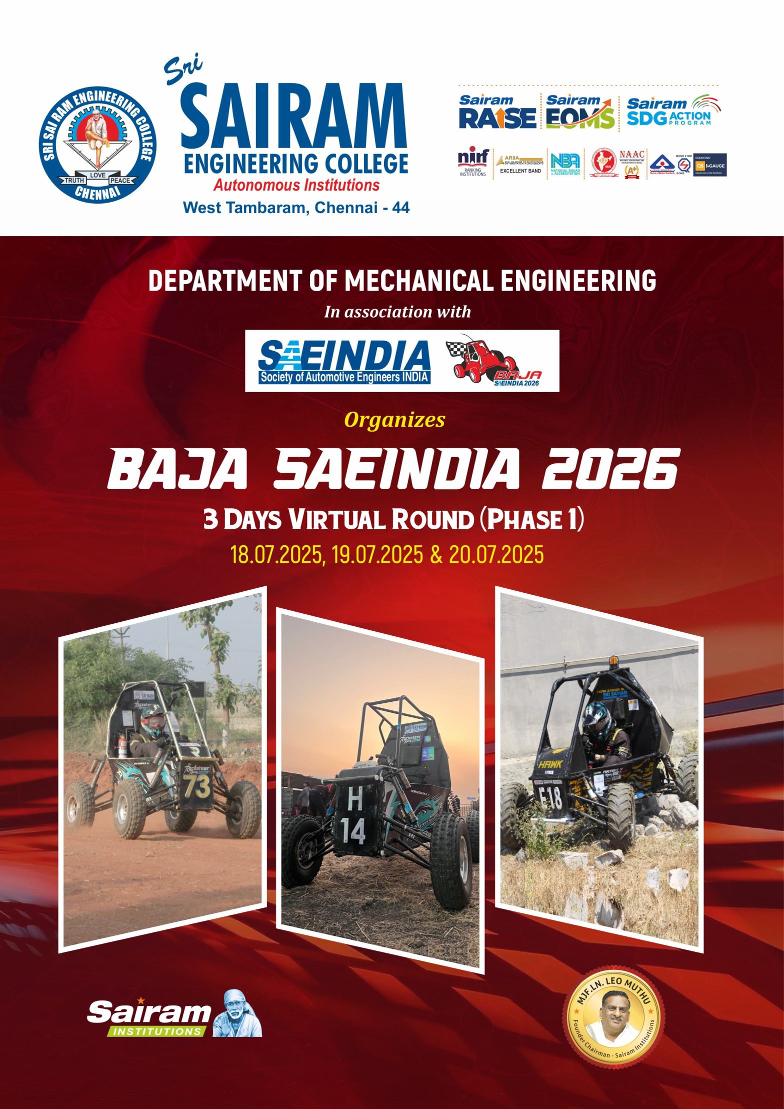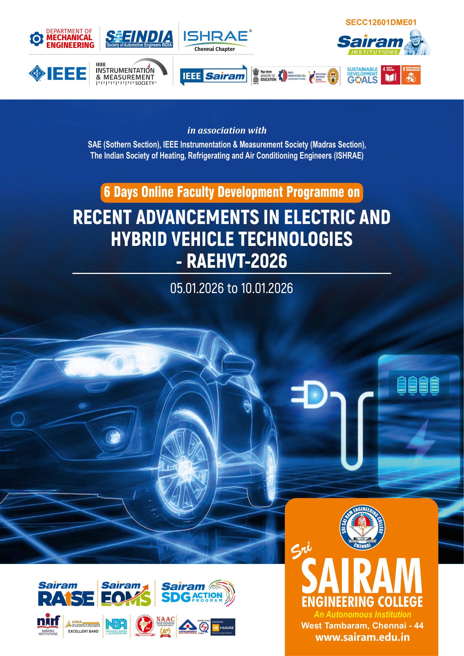 Organized a 6 Days Online Faculty Development Programme on “Recent Advancements in Electric and Hybrid Vehicle Technologies – RAEHVT-2026” between 05.01.2026 to 10.01.2026 in association with SAE (Sothern Section), IEEE Instrumentation & Measurement Society (Madras Section), The Indian Society of Heating, Refrigerating and Air Conditioning Engineers (ISHRAE)