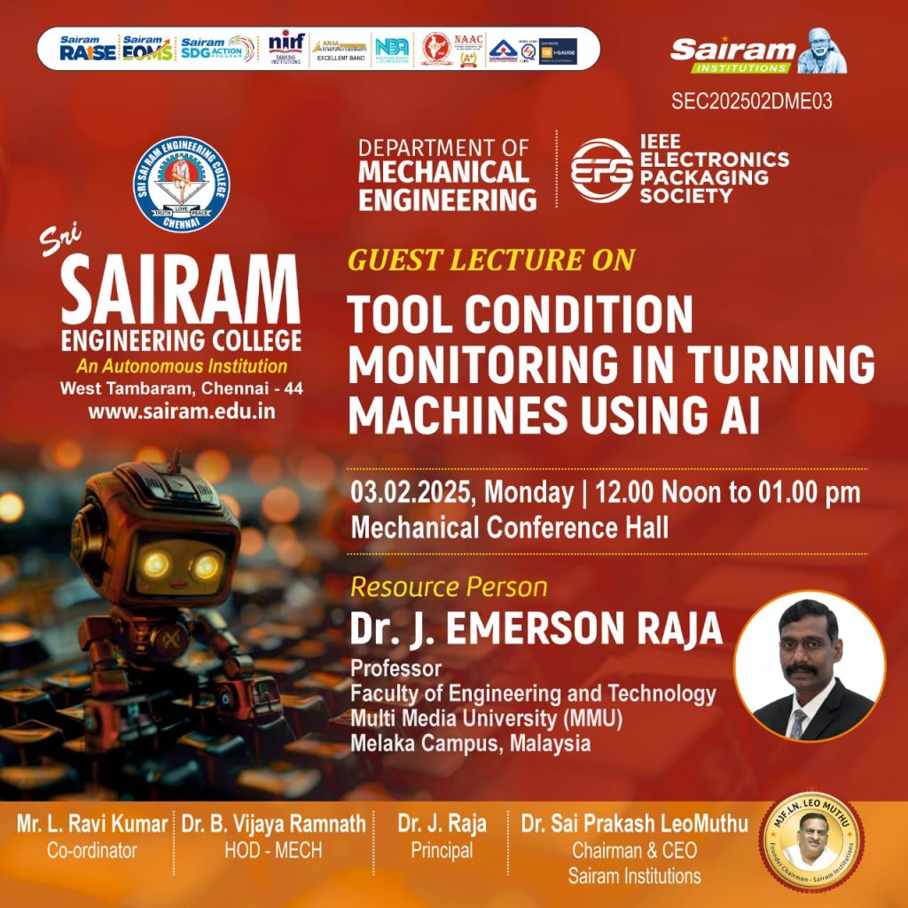 Department of Mechanical Engineering has organized a Guest Lecture in “Tool Condition Monitoring in Turning Machines Using AI” on 03.02.2025, Monday, 12.00 Noon to 01.00 pm, at Mechanical Conference Hall. Chief Guest: Dr. J. Emerson Raja, Professor, Faculty of Engineering and Technology Multi Media University (MMU) Melaka Campus, Malaysia have handled the session.